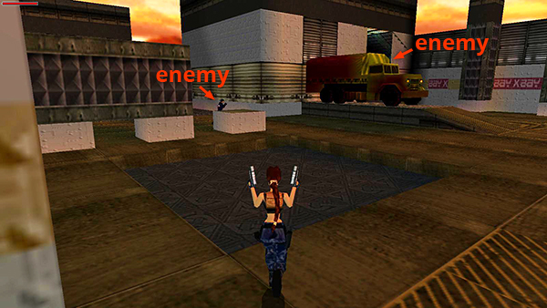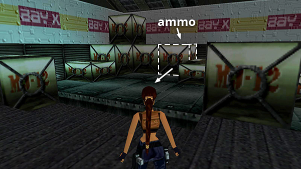 Climb the stack of boxes on the left to find some Desert Eagle clips and a small medi pack (31-32) in a depression in the middle of the pile. (screenshot) Climb down and head for the far right corner of the storeroom (i.e., the right when Lara's back is to the entrance). The fourth box from the corner is movable. (screenshot) Pull it out to reveal an alcove containing Uzi clips and grenades (33-34). When you have everything, step into the back of the truck to end the level. (screenshot)