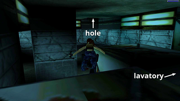 If you're struggling with this swimming sequence, as long as you saved before dropping through the hole in the tower, you can change your mind and try the shortcut described above. In order to do that, you must first drop through the square opening to the right of the satellite dish (not the one above the pool) and follow the stairs down and around to the ledge below the doorway. Then follow the sequence shown in these screenshots.