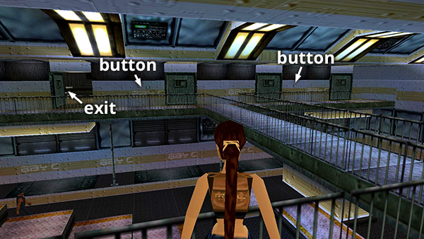 NOTES: If the guard spots Lara and starts shooting, you can either reload and try the sequence again, or run down the hallway to the right and quickly press the button in the alcove opposite the grate, marked B on the map, to shut the door so the guard can't get in. Wait for him to wander off and then press the button again to re-open the door. I'll include a reminder about this later on in case you forget.