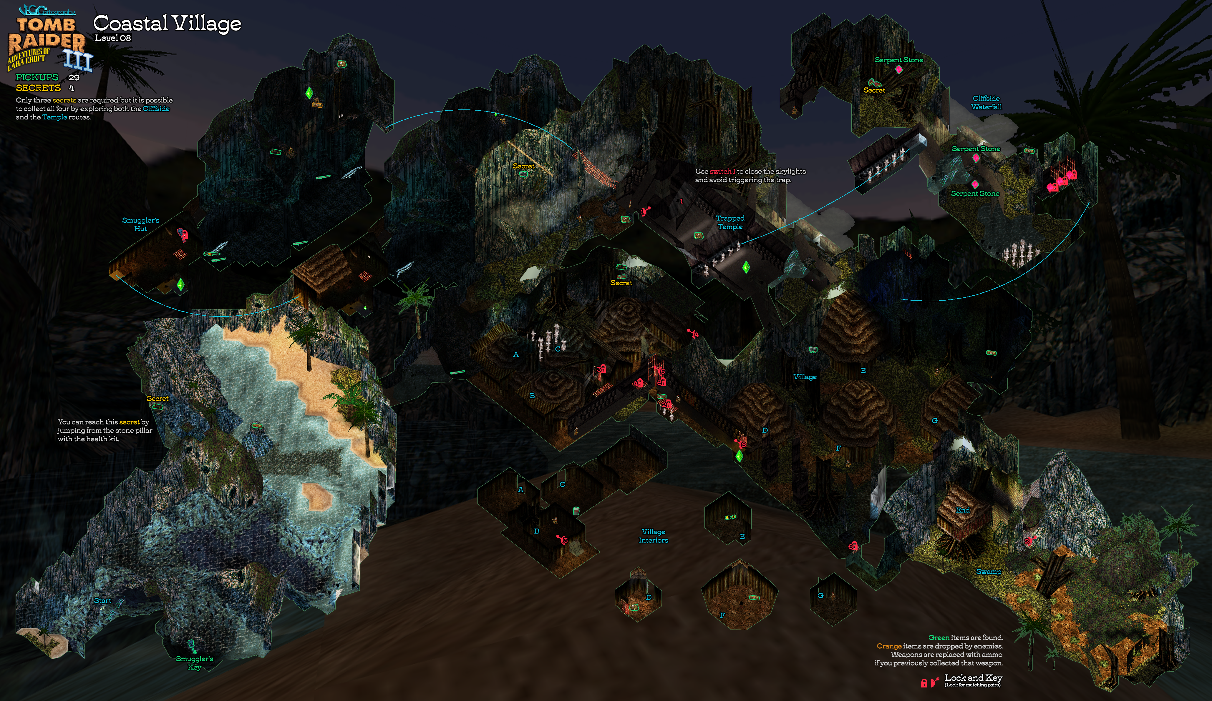 NOTES: Like the River Ganges, there are several possible routes through this complicated level. This walkthrough covers the route with maximum kills, items, and secrets, but I've also included a few notes about shortcuts and alternate routes. There are four possible secrets, even though the statistics screen in the classic game (accessed through the stopwatch in your inventory) says there are only three. In the classic game, you only need 59 total secrets to access the bonus level at the end of the game. So, you can miss one and make up the difference here. In the remaster, you'll need all 60 secrets for 100% completion, and all four secrets in this level for the "Codex of Polynesia" achievement/trophy. This guide covers the path with all four secrets. Also, in the remaster, you can finish the level with 30/29 items. I'm not positive, but the extra item may be the SWAMP MAP that Lara receives in the cutscene at the end of the level.