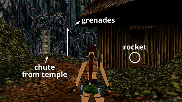 There's a rocket (22) lying on the floor inside the hut opposite the one where the tribesman with the club emerged. Grab it. Then go around to the rock wall next to that hut. Pull up onto the flat ledge between the hut and the stone doorway to get some grenades (23). There's no need to jump to reach the ledge; just stand facing the wall and press Action + Forward. (screenshot)