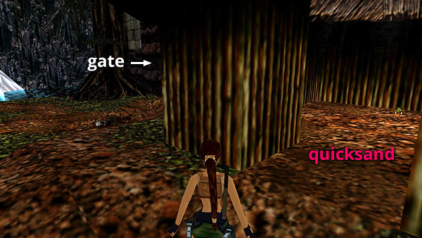 Just opposite the entrance to this hut is a huge, wooden gate flanked by stone arches with torches on top. There's a save/power-up crystal (5) behind the hut to the right of the gate. (screenshot) Inside that hut is a quicksand trap. You can't reach the large medi pack inside, so don't bother trying. (screenshot) Around the right side of the quicksand hut there's a path leading to another section of the village. A spike pit blocks the way, but you'll return there later.
