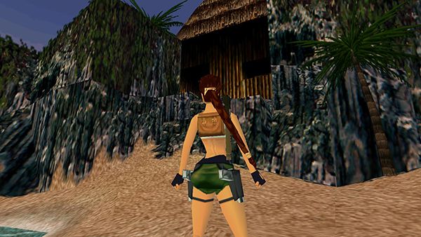 Alternatively, if you slid down from inside the TEMPLE WITH SKYLIGHTS AND DART TRAPS, you'll enter the village on the lower level. Move forward and take out a tribesmen with a spiked club who approaches from the hut ahead and a warrior with a a blowgun on the ledge to the left. If you side flip from left to right while shooting the one with the blowgun, you may be able to avoid being poisoned. (screenshot)