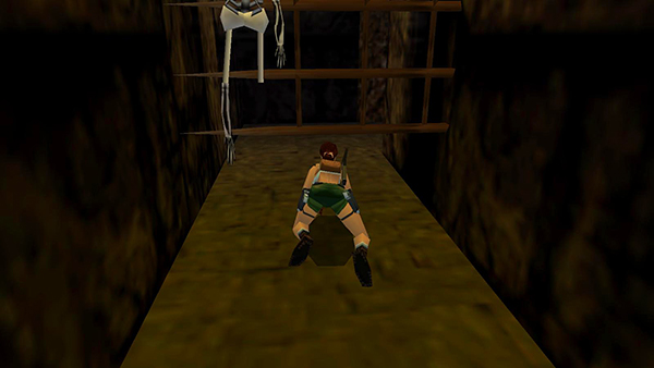 Take a standing jump–grab from the end of the walkway to the ledge below. (There's nothing to grab, but pressing Action alters Lara's trajectory so she doesn't bang her head on the rocks.) Drop back to hang from the ledge, then traverse left and pull up. Turn left, walk to the edge, and take a standing jump to grab the next ledge. Pull up and follow the passageway out of the cavern. (screenshots)