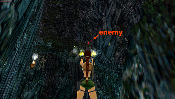 LARGE CAVERN WITH POOL: Draw pistols and shoot the 2 crocodiles (1-2) in the water and the warrior (3) with the blowgun on the stone bridge high above on the right. (screenshot) He shouldn't be able to reach Lara with his blow darts from there. If you don't kill him now and he manages to hit you later, you'll need to use a medi pack or power-up crystal to antidote the poison.