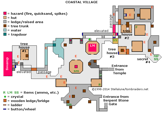 ENTERING THE COASTAL VILLAGE: This area is shown the VILLAGE MAP. Both entrances, from the SERPENT STONE GATES and from the TEMPLE WITH SKYLIGHTS AND DART TRAPS, are marked near the lower left. I've linked to it instead of including it on the page so you can choose whether or not to print it. Note that the map includes some spoilers, such as the location of various items, enemies, etc.