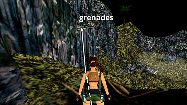 MISTY HILLSIDE: Move through the opening in the trees into an open area at the top of a hill. Before sliding down into the next area, take a running jump to the flat, gray block on the left, where you'll find some the grenades (3). (screenshot) Then drop down and continue to the bottom of the hill.