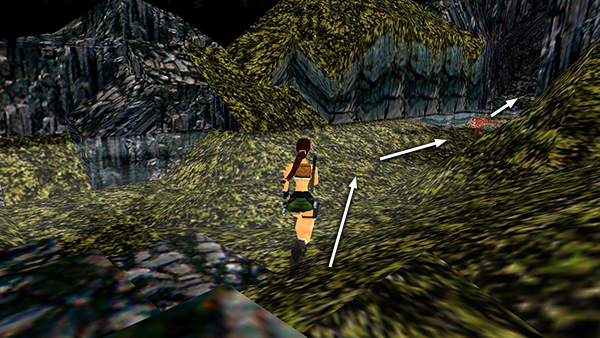 CAVE WITH SWITCHES: To reach this cave, start by positioning Lara so the passage where you entered this area is on her right and the airplane fuselage is on her left. Above and behind is a rectangular stone ledge. Ahead is a lumpy, green wall with a sloping base. Jump up to the flat, triangular spot in the left corner. (This is the same triangle mentioned in the tactic for evading the last raptor.) Face the green wall and jump straight up to grab the edge. Traverse to the right so Lara is hanging in the middle of the wall. Pull up and before Lara can slide back, press Jump to backflip onto the stone ledge above and behind her. Turn around and you'll see a crawlspace. (screenshots)
