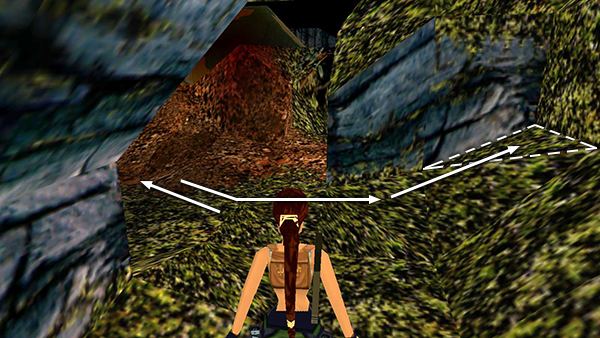 Alternatively, you can get the raptor's attention, jump onto this triangle and then continue toward the CAVE WITH SWITCHES, as described below. You'll have a chance to shoot at the raptor again in a moment.
