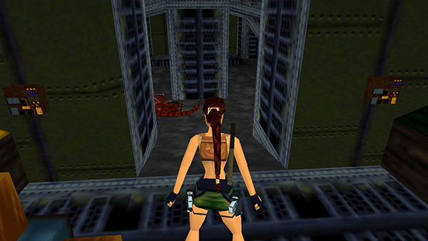NOTE: If you're using an analog controller with the PlayStation game and you're having trouble with the sequence described above, try using the left Analog Stick instead of the D-pad to climb the ladder. This should give you greater control. Climb all the way down. Then press lightly on the stick, so Lara climbs up one rung at a time. Then when her feet come up onto the lowest rung, take the backflip.