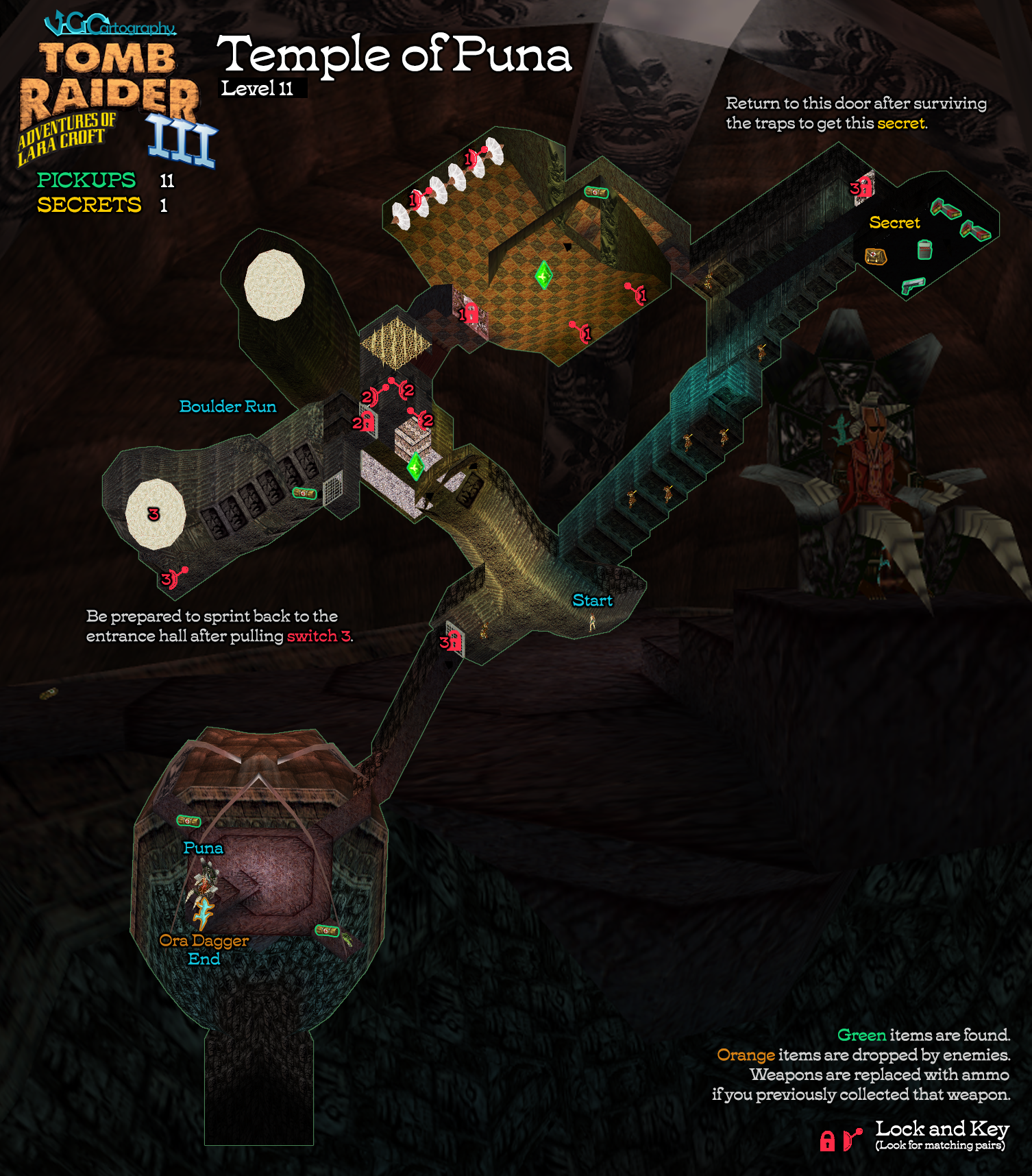 NOTE: In some versions of the game, this lizard-shaped artifact will be called ELEMENT 115, and you'll get the ORA DAGGER in the last Nevada level. TR3's head level designer, Richard Morton, told The Tomb Raiders Traveler's Guide this is a typo, and Puna's artifact should be the ORA DAGGER. If this bothers you, Mr. Sardoc has created a patch to fix the artifact name mix-up, along with numerous other bugs. See this thread on tombraiderforums.com for details and download link.