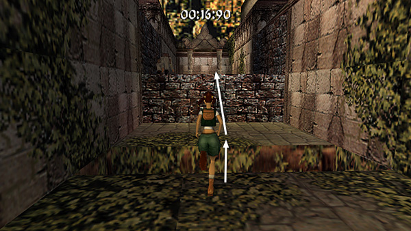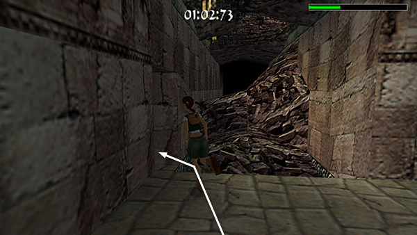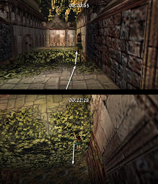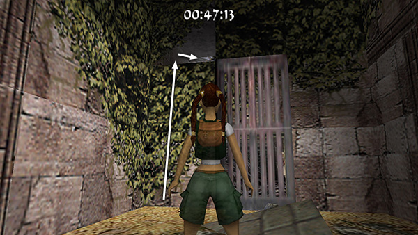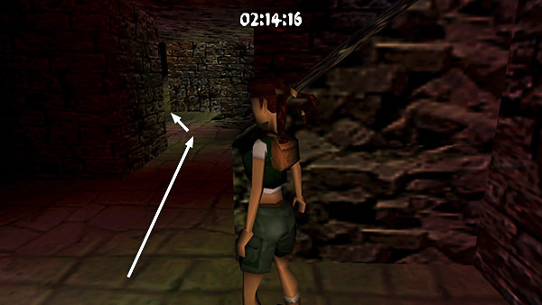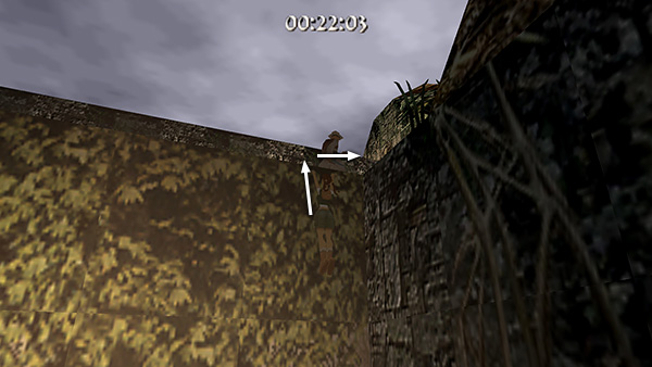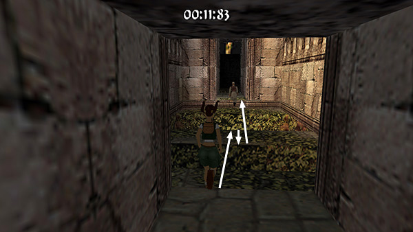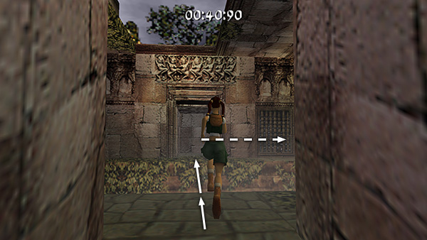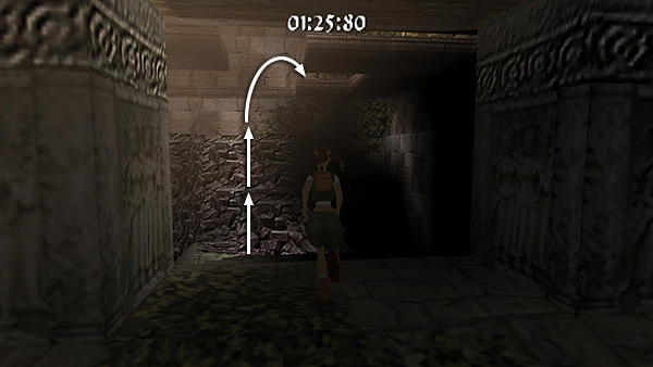 The room beyond the gate contains a shallow pool, which you'll want to avoid to save time. Run around the left edge of the pool, taking running jumps across the corners of the pool if you feel comfortable doing so. (screenshot) Jump up onto the right side of the block at the end of the walkway. (screenshot) Then side flip to the left into the passageway above. (screenshot) Of course you can also just climb up into the passageway, but this takes a little longer.