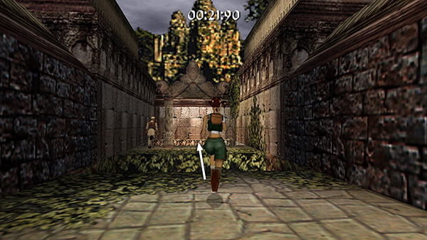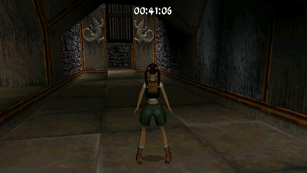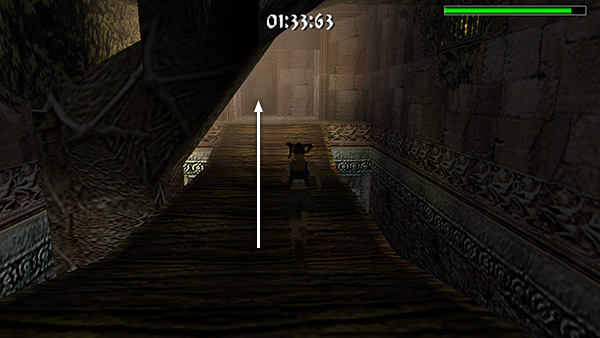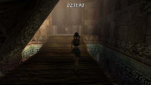 Continue to a wooden bridge spanning another pit. Sprint across the bridge (screenshot) and follow the next twisting passageway to another room with a pool of water. Stick to the walkway so you don't lose precious seconds, but if you like, you can use running jumps to cut corners and get across more quickly. Run through the gate on the other side of the room. (screenshot)