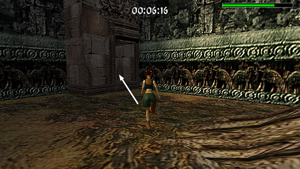 If Von Croy reaches this door before you, he'll pass through and it will begin to close behind him. (screenshot) Either dive through before it closes all the way, or to re-open it, step up to the small, rectangular niche on the wall to the right of the door and press Action. Lara will reach in and operate a mechanism to open the door. (screenshot) This is new to TR4, and you'll be doing it frequently in later levels.