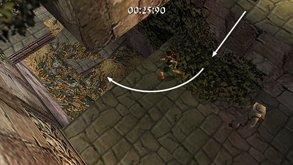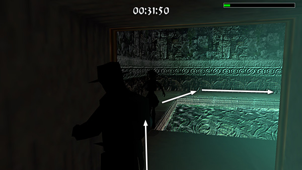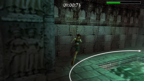 Follow the short passageway, roll and grab the edge, then drop into the room below, which also contains a pool. (screenshot) As soon as Lara hits the ground, turn right (screenshot) and run/sprint around the edge of the pool to the far corner. (screenshot) There's a pile of rocks blocking the path ahead. Don't try and jump over it. Instead make a sharp left turn into the doorway before the rock pile. (screenshot)