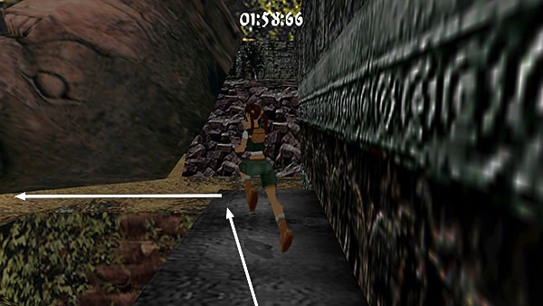 Continue along the passageway to a room with uneven, gray rocks. To quickly reach the ledges above, run forward and position Lara at the left edge of the base of the first slope. Take a standing jump to the top of the slope, another standing jump onto the block ahead, then side flip to the right to land on the ledge above. (screenshot) Run around to the right and jump across the gap into the doorway. (screenshot) Run/sprint across the wooden bridge and through the wide doorway on the other side. (screenshot)