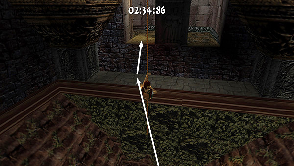Continue to the next room, where you'll need to jump forward, grab the bars on the ceiling, monkey swing across the pit, and drop onto the ledge on the far side. (screenshot) If you fall down, run forward and climb the far wall to get out of the pit, again losing precious seconds.