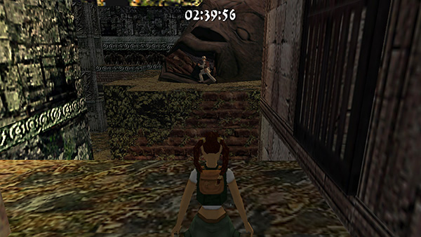 Run across the next wooden bridge. Ignore the dangling vine and jump up into the doorway on the left. (screenshot) Turn left, then immediately turn right into the passageway just before the wide opening overlooking the giant statue head. (screenshot) Continue to a ledge behind the big head. (screenshot) As you run along beside the head, the camera shifts to a wide-angle view. Ignore it and run through the giant statue's open mouth to drop into the room below. (screenshot)