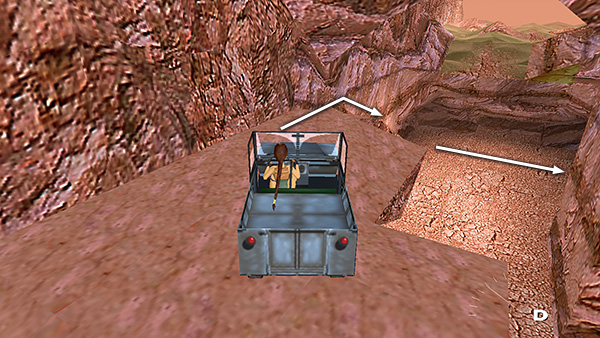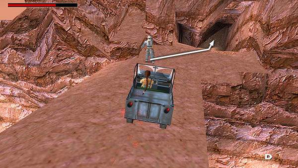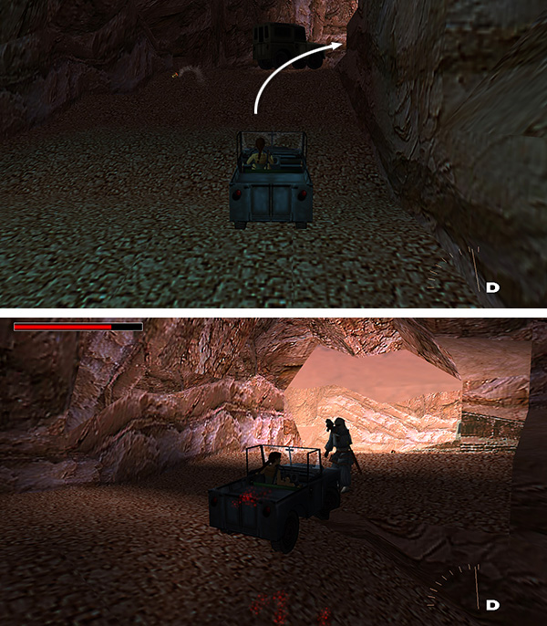 PIT WITH SPIKES AND ROCK BRIDGE ABOVE: As you emerge from the tunnel, you'll come to an open area with a deep pit spanning the entire width of the canyon. The Land Rover will keep to the left, using the ramp to jump across the pit. You should stay close to the right wall here, ride up the slope and then left across the narrow rock bridge, running over another mercenary (10) in the process. If you want all the secrets, stop the Jeep here and get out. The Land Rover waits below and continues to poop out grenades. Just ignore it for now. The guide will get bored after a while and drive off. (screenshots)