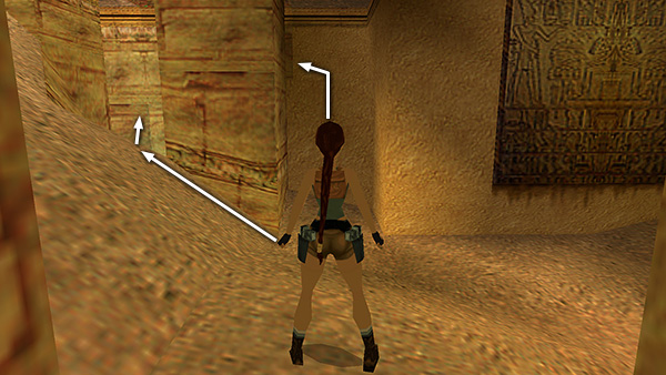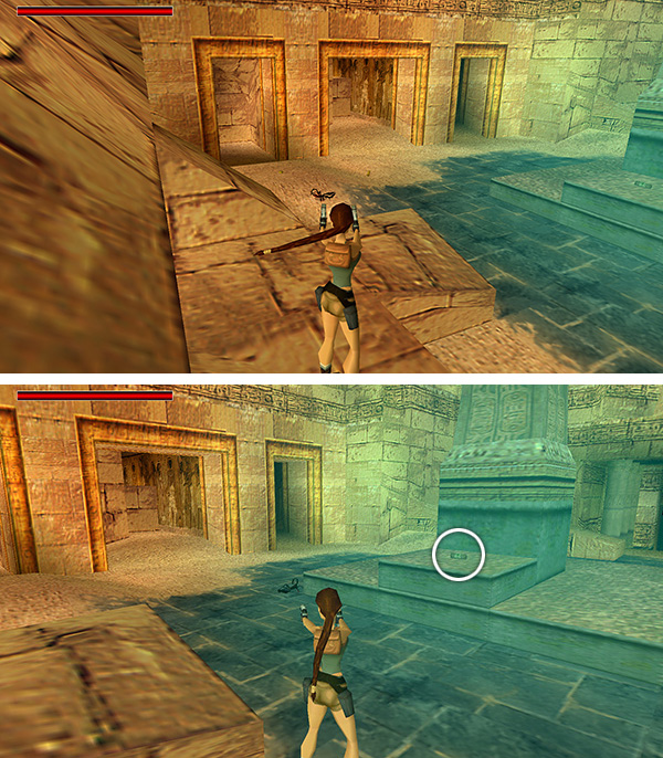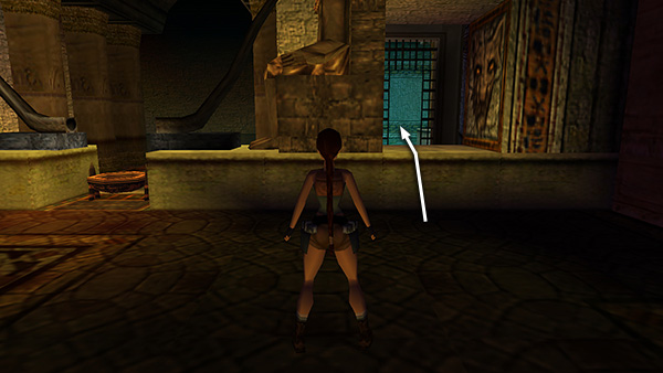 HALLWAY LINED WITH COLUMNS: Enter the ruins here. In the anteroom with the square mosaic in the floor, notice the carved, gray door on the right. You'll return here later. For now, continue up the ramp. There is a pool at the top of the stairs, but Lara will look up to the righta none-too-subtle hint. Use the block to climb onto the ledge above. Turn around and take a running jump over the opening in the floor to the walkway in the center, then a standing jump to the far walkway. Pick up Uzi clips (11) and shotgun shells (12) in the corners. Then jump back to the center walkway and and use the mechanisms in the 2 niches to open the gates. Inside the left alcove is a small medipack (13) on the floor and a SHOTGUN (14)—or shotgun shells if you already have the gun—on the pedestal. Inside the right alcove is another pedestal with CANOPIC JAR 1 (15). (screenshots)