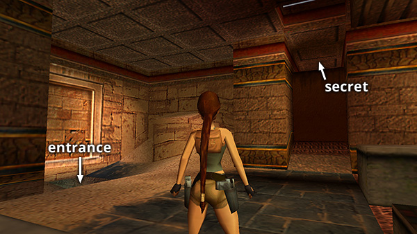THREE GOLDEN DOORWAYS: Enter through the middle doorway. Vault up onto the stone block just inside, then climb onto the ledge on the right. Jump over to the next ledge to get a small medipack (2). Turn around and take a standing jump back to the middle ledge, then a running jump to the next ledge. Pick up some Uzi clips (3). Finally, jump into the alcove in the far wall for a box of wideshot shotgun ammo (4). Safety drop into the room below. Drop into the shallow pit and crawl through the small opening. This is SECRET #1 (26/70). As soon as Lara can stand, draw guns and kill a black scorpion (3). (screenshots)