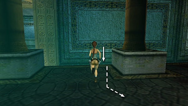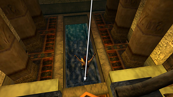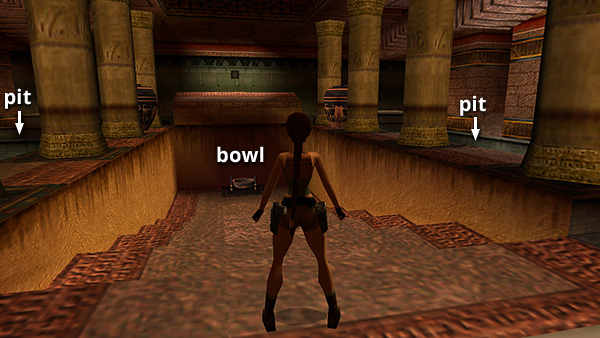 NOTE: Lara will lose a little health in the fall even if you safety drop, but if you use the modified safety drop maneuver, described in my Useful Bugs section, she'll land safely in the pool below the BOWL. (screenshot)
