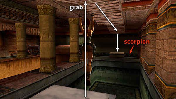 After getting the medipack, climb out of the pit, stand on the higher of the two white marble steps, and jump up to grab the handholds on the ceiling. Monkey swing across the pit, drop onto the block on the other side, and kill another scorpion (10) lurking on the floor near the block. (screenshot)
