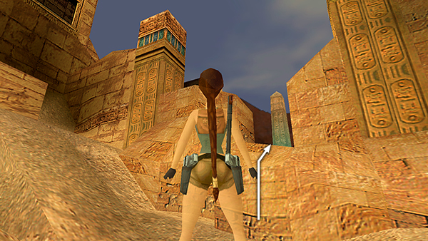 COURTYARD WITH OBELISK: The level begins in an open area with pillars. Turn left (west) and climb over the ruined wall into a courtyard with a pointed obelisk. (screenshot) Two black scorpions (1-2) emergeone on the ground to the left, one from behind the obelisk after you step down onto the floor. Shoot them with pistols before they get too close. (screenshots)
