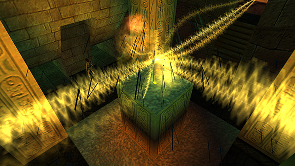 Cutscene: An ancient mechanism is activated, causing electricity to jolt from the point of each needle. This shatters the glowing pyramid, revealing a golden artifact. (screenshot)