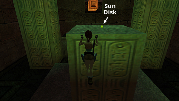 Climb onto the block where the pyramid was and pick up the SUN DISK (13). (screenshot) Taking it opens a trapdoor in the floor near the west wall. (screenshot) Drop through the opening and follow the passage back to the SACRED LAKE.
