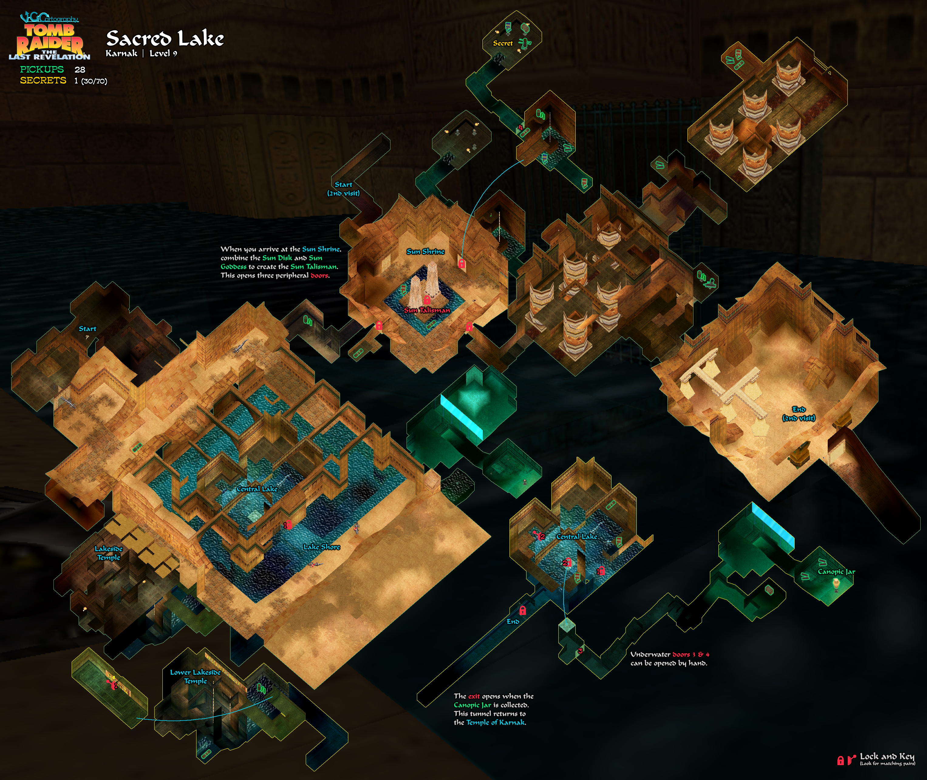 NOTE ON MISSING ARTIFACTS: You need both the SUN GODDESS and SUN DISK in order to complete the SACRED LAKE (second visit). You can either go back to get whichever item(s) you're missing, use the level-skip cheat to advance to the beginning of the Tomb of Semerkhet, or download a PC save file, in which Lara has just used the artifacts.