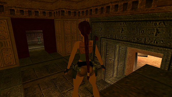 ANTEROOM AND EXIT TO THE OUTDOORS: There are two exits from this room: a doorway framed in dark reddish stone and a brightly lit opening leading outside. (screenshot) First, go through the dark stone doorway and pick up flares (17) and the UZIS (18) (or Uzi ammo if you already have the guns) from the pedestals. Then return through the previous room and exit the building. Cross the bright, sandy area and approach the door between the two statues of Seth to end the level. (screenshot)