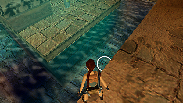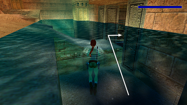SMALL POOL WITH TWO OBELISKS (after activation): The EAST DOOR, through which you entered this area, is now a dead end. The NORTH DOOR contains a crawlspace with a small medipack (4). (screenshot)