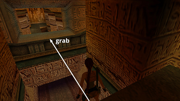 Return through the flooded passage the way you came. Surface, and climb up to the vertical pole. Stand close to the pole and hold Action to grab onto it. Climb up until Lara is hanging just above the greenish horizontal stripe on the wall. Pivot so the small ledge with the flares (12) is behind her. Then press Jump to backflip onto the ledge. Pick up the flares. Then jump from the corner of the ledge to the doorway. Follow the corridor back to the POOL WITH THE TWO OBELISKS. (screenshots)