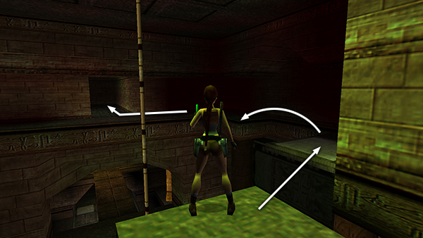 Return downstairs to the high ledge overlooking the LARGE ROOM WITH TWO DANGLING ROPES. Take a running jump to grab the nearer rope. (screenshot) Without letting go, slide to the bottom of the rope and turn until Lara is facing the uneven, gray ledge in the northwest corner. Press Sprint/Dash to swing forward and then jump off the rope to land on the ledge. (screenshot) See the rope swinging tips in the footnote if you need a refresher. Climb into the crawlspace on the left and follow the passage to the next room.