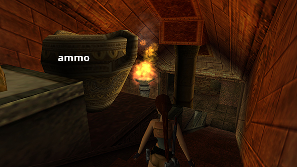 Beyond this doorway, staircases to the left and right both lead down to the level below, so you can go either way. The big double doors with the ankh symbol open as you approach, and 2 jackals charge out. Kill them. (screenshot) Avoid the lit burners and continue downstairs to a small room with 2 ceramic jars. Shoot the jar on the right to get some Uzi ammo. (screenshot) Go down the next set of stairs, stopping on the way to get shotgun shells from the breakable jar between the two sets of stairs. (screenshot) Again, don't get too close to the lit burner.