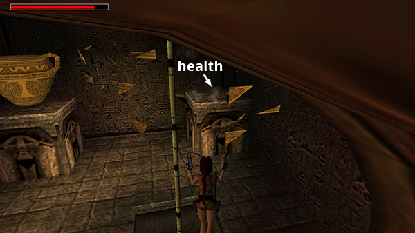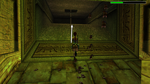 Save the game first, obviously. Position Lara on the south side of the opening surrounding the climbing pole (i.e., Lara will be facing north with the brazier on her right and the 2 ceramic vases on her left). Jump or run off the edge and grab the pole. Slide almost to the bottom. Don't go all the way down or the beetles on the floor below will start biting. Hang onto the pole for a few moments to let the beetles gather. Then press Jump + Roll (or Jump + Up + Down on the keyboard) to jump off the pole, twist in the air, and land beyond the beetle swarm facing the other way (south). Run/jump to the rectangular niche directly ahead. Quickly press Action to grab the small medipack (4) inside. Immediately roll and take a standing jump over the beetles as they begin to swarm around you. Use a health pack if necessary as you continue to run/jump across the room, veering just a little to the left or right to avoid the pole. (screenshots)