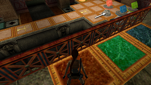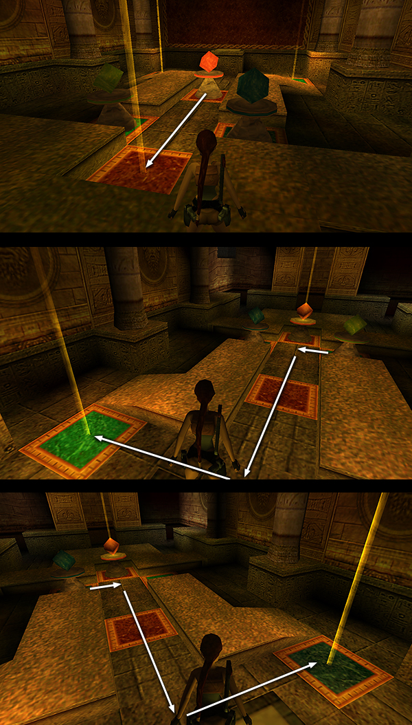 NOTE: If colorblindness makes puzzles like this a challenge for you, the tiles that Lara steps on to move the pieces are red, green, and blue from left to right. The game pieces in their starting positions are blue, green, and red from left to right. You can also download a PC save file for either the winning or losing path.