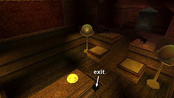 Drop back down onto the cage and follow the hallway to a door that opens as you approach. Hop down into the room below. Off to the right is a high crawlspacethe alternate exit if you win the senet game. (screenshot) Enter the room with the red floor to END THE LEVEL.