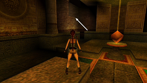 The door on the west wall is now open. Shoot the vase to the left of it, jump over the gap in the floor, and retrieve the small medipack (5) that was inside the vase. (screenshot) When you go through the door, it closes behind you.