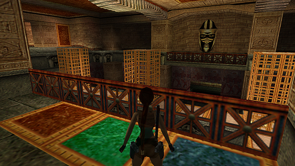 ROOM WITH TWO RAMPS – LEVEL EXIT: Go through the doorway opposite the climbing pole and pull up through the hole in the ceiling into a room with two ramps covered in carved hieroglyphs. There's also a doorway above the ramps and another opening in the ceiling. Turn around and jump to grab the black switch above the hole in the floor. This raises a golden cage between the two ramps. Climb back up through the hole in the ceiling. Go up either ramp and climb onto the cage. Then pull up through the opening in the ceiling above the cage to find SECRET #7 (37/70), the UZIS or Uzi ammo, a large medipack, and explosive arrows (38-40). (screenshots)