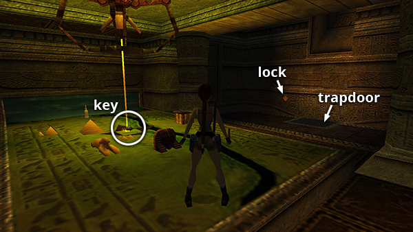 Cutscene: The mechanism on the ceiling activates, tracing a path over the map with a beam of golden light. When the beam alights on one of the pyramids, it opens revealing a pyramid-shaped key. (screenshot)