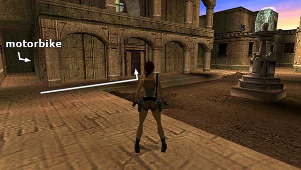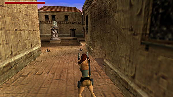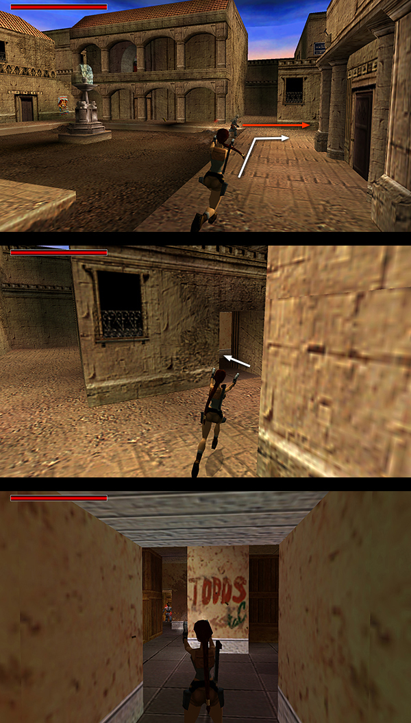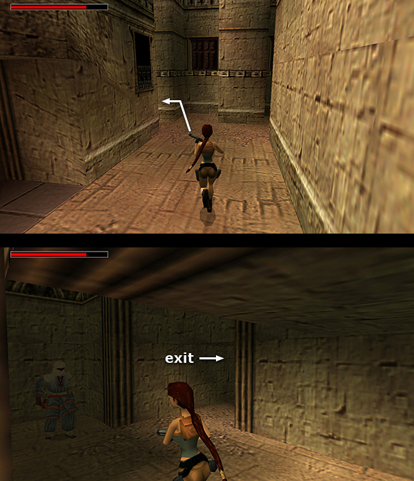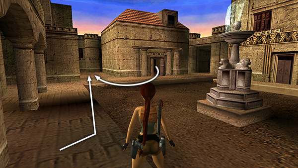 Go out onto the ledge overlooking the COURTYARD and head to the left. Two blue-robed gunmen (6-7) start taking potshots at Lara from the next building. One is just ahead on the right. The other is off to the left. If you'd rather not jump over and confront them, you can run almost to the end of the ledge and target the first gunman without taking fire from the second. Then step out a little farther so Lara can aim at the enemy on the left. (screenshots)