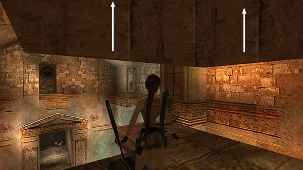 NOTE ON BUGGY ITEMS IN THE ROOM WITH THE FIRST TRIDENT: I can't promise this will work exactly as I have written, but here's what I've discovered so far: There are 4 breakable jars in the alcove on the east side of this room (i.e., the right side as you enter). (screenshot) Only two of the jars contain items, but the triggers appear to be programmed incorrectly. If you shoot only the two jars on the left side of the alcove, a box of shotgun ammo should appear on the ledge just in front of the one with the jars (or occasionally on the ledge to the north). If you shoot the two jars on the right side of the east alcove when you first enter this area, you won't receive an item, but if you wait until after destroying all 7 skeletons, then shoot the jars on the right side of the alcove, a small medipack should appear somewhere on the north side of the room. If you wait until you've destroyed all of the skeletons, you should then be able to smash all of the jars at once and get both items. These items appear in different places, which may be related to where the skeletons are when you destroy them. These screenshots show a few of the possibilities.