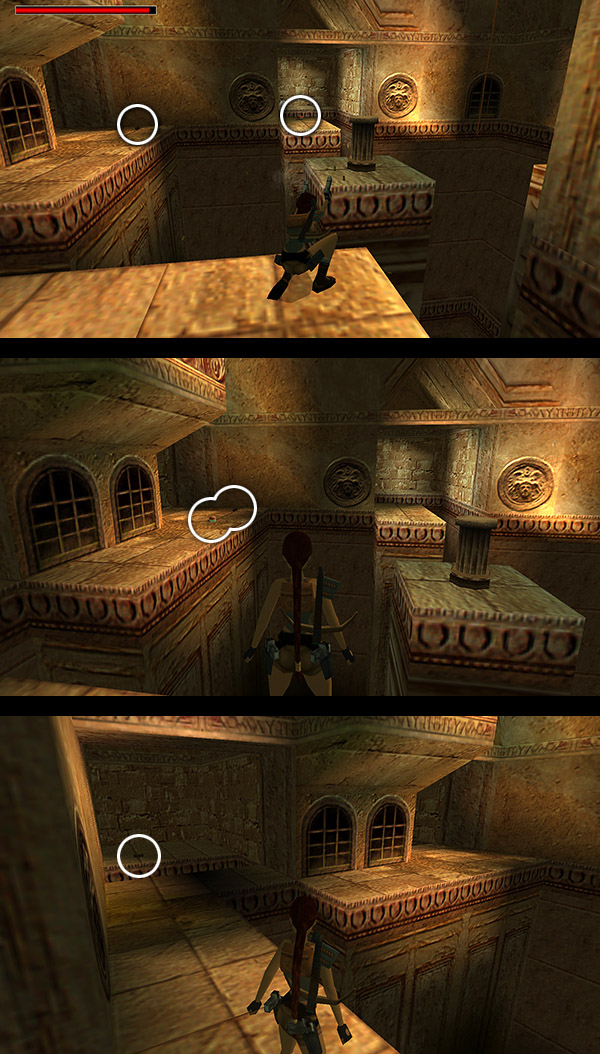 USING THE CORNER BUG TO OBTAIN SECRET #1: If you used the ropes to swing over to the alcove on the west side of the HUGE ROOM WITH HIGH PLATFORM, ROPES, AND SMALL POOL then saved the game, you will no longer be able to reach the first secret; however, you can still get it by using the crawling corner bug. First, use the climbable wall at the back of the western alcove to climb down to the floor. Turn around and run back across the room to the base of the high platform. Then use the crawling corner bug to get back on top of the high platform with the lever, as shown in this set of screenshots. From there you can reach the dangling ropes and swing over to the secret.