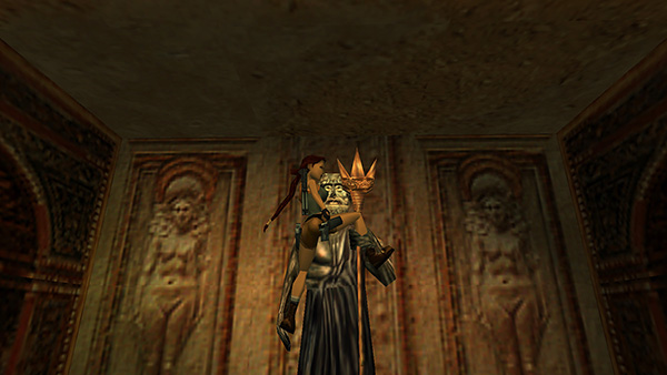 Cutscene: Lara climbs the statue and places the TRIDENT at the top of its staff. Water begins to flow in the room below.