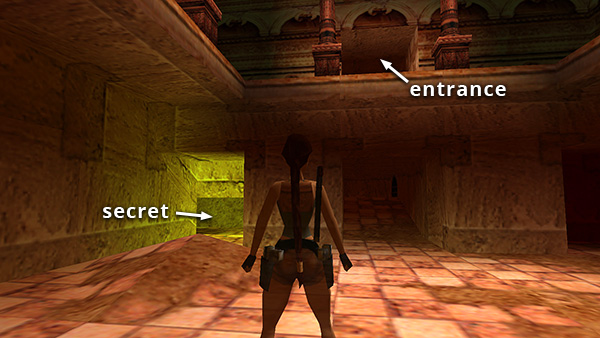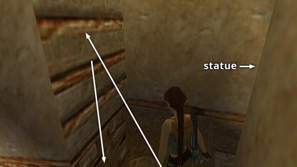 HALLWAY TO THE NORTH – FIRST POSEIDON STATUE: We'll start by entering the the passageway between the small ramps, ahead on the right if Lara's back is to the climbable wall. (screenshot) Continue to a ROOM WITH TWO LEVELS SUPPORTED BY COLUMNS. Two skeletons (1-2) emerge when you enter, one on the left, one on the right. Use your favorite skeleton-destroying technique to deal with them. (screenshot) Drop down into the sunken area in the middle of the room. Then find the crawlspace in the southeast corner. This leads to a SECRET (49/70), normal arrows and a small medipack (1-2). (screenshot)