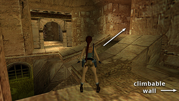 IMPORTANT: You will need 4 TRIDENTS to complete this level. If you don't have all of them, you should return to the CATACOMBS to get them. If you've already spent time exploring the TEMPLE OF POSEIDON and can't find your way back, return to the JUNCTION WITH DEEP PIT and scale the climbable wall in the northeast corner. (screenshot) Position Lara's feet on the lowest rung of the ladder at the top, then backflip into the alcove. Follow the passage back to the CATACOMBS. Use these notes to locate any missing tridents.)