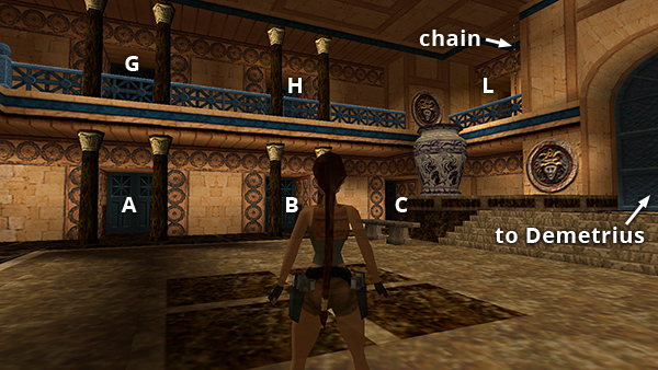 You enter this level through a crawlspace from the TEMPLE OF POSEIDON. Go through the next crawlspace and drop down into a hallway with a lantern. Continue in either direction to reach the MAIN HALL WITH TWO LEVELS AND MANY BLUE DOORS. This room is the hub for all of your explorations in this level. It is illustrated in the diagram at right and in these screenshots of the north wall and south wall.