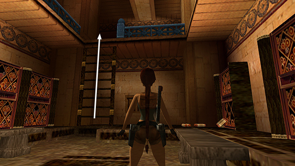 Follow the hallway to the west, shooting the ceramic vase and picking up a small medipack (14) on the way. Back in the READING ROOM with the scattered scrolls, you'll notice a ladder on the wall next to the entrance. If you followed this walkthrough so far, the trapdoor at the top of the ladder is still closed, so you can't go that way. Instead, return up the stairs the way you came to the MAIN HALL. (screenshots)